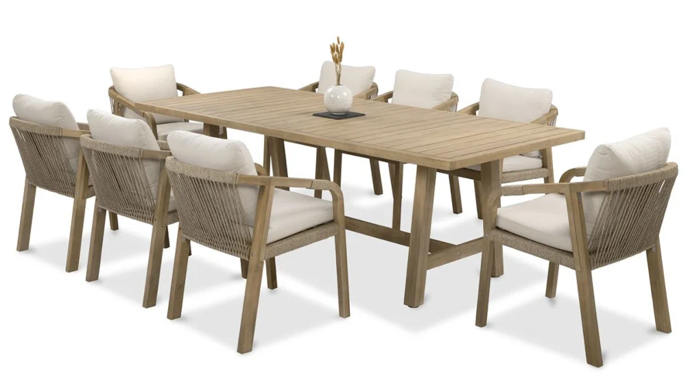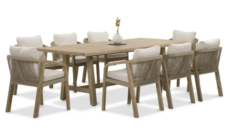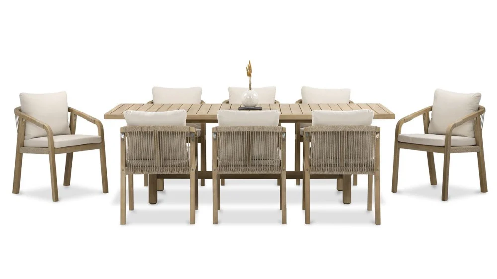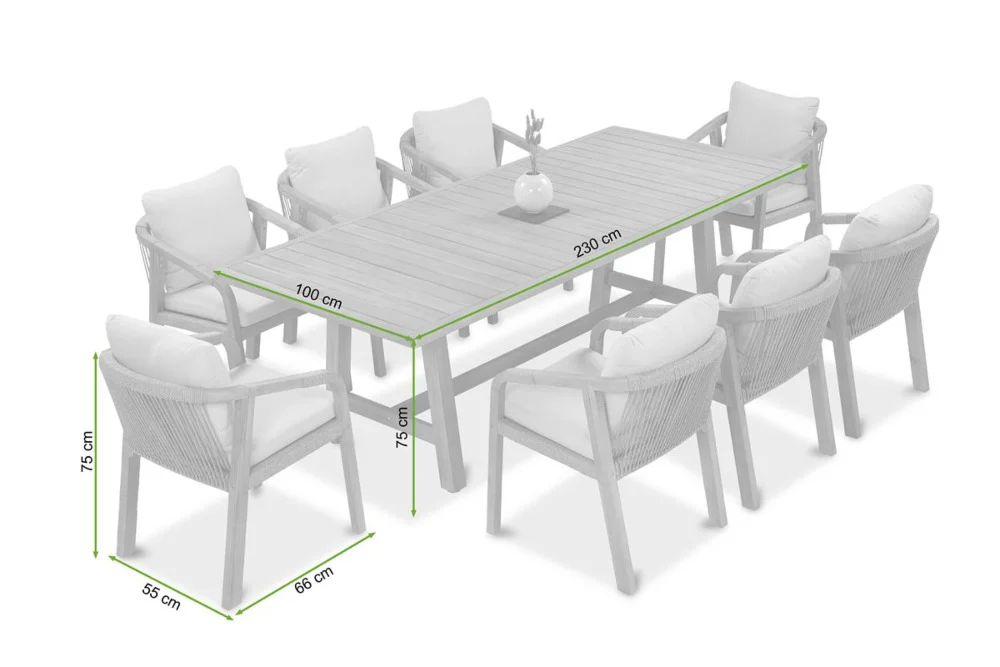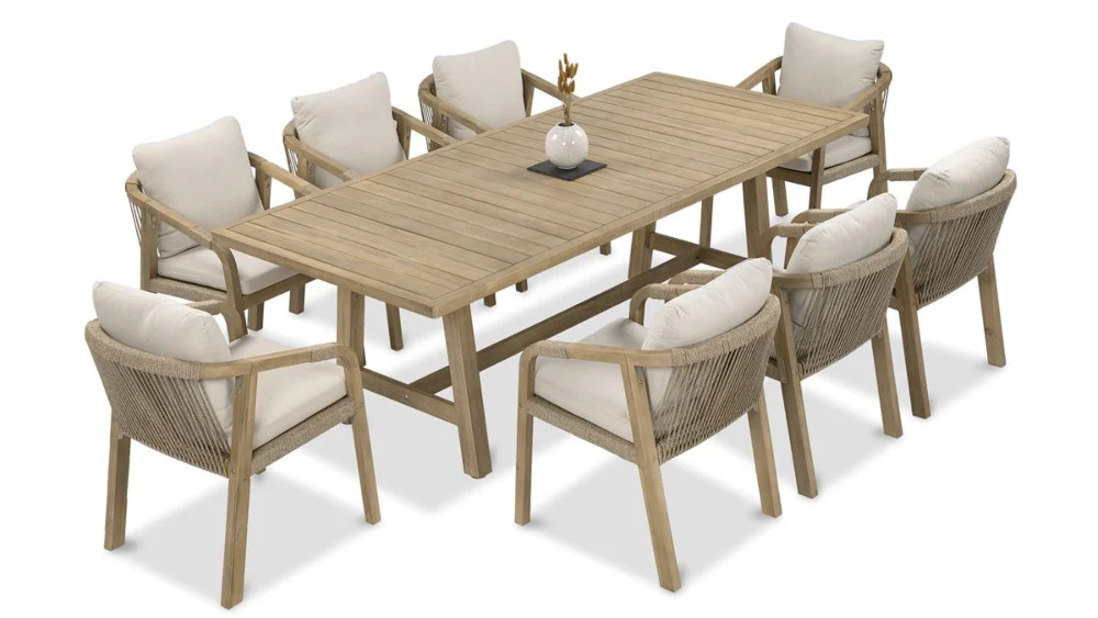 Откройте себе уникальный обеденный набор, который не только подчеркнет стиль вашего сада, но и создаст удивительную атмосферу элегантности и комфорта. Столовый набор MARIGOLD 8+1 Dining – Furrore – настоящий шедевр функциональности, дизайна и комфорта, который непременно оправдает ожидания самых взыскательных любителей садовых встреч. Прямоугольный стол внушительной длины 220 см и восемь удобных кресел со спинками, обмотанными полиэфирной веревкой диаметром 6 мм, сочетают современный дизайн и высокое качество исполнения. Использованный тик 01A из дерева акации создает экзотическую атмосферу, переносит вас на тропические пляжи и экзотические праздники. Каждое кресло укомплектовано мягкой подушкой, чехлы которой изготовлены из высококачественной ткани льняной элегантного бежевого оттенка, что придает всему комплекту дизайнерский акцент. Мебель отличается не только эстетичностью, но и высокой прочностью и устойчивостью к погодным условиям и УФ-излучению. Благодаря этому вы можете наслаждаться ими в течение многих сезонов, а легкость их содержания в чистоте превращает уход за ними в настоящее удовольствие. Приглушенные цвета мебели позволяют творчески комбинировать их с натуральными материалами, такими как лен, лоза, дерево или хлопок. Столовый набор Furrore MARIGOLD 8+1 – это не только садовая мебель, это выражение престижа, стиля и превосходного вкуса. Идеален как комплексное обустройство современной террасы в оригинальном стиле, этот комплект непременно станет украшением вашего сада на многие сезоны. Инвестируйте в качество изготовления, долговечность и уникальный дизайн, создавая место, где встречи станут уникальным опытом. Помните! Чтобы деревянную мебель можно было безопасно использовать на улице, ее необходимо правильно подготовить. Таким лечением является импрегнация. Он предусматривает нанесение на мебель специального средства, защищающего мебель от контакта с влагой, а следовательно, от разрушения или деформации. Еще один способ оградить деревянное оборудование от погодных условий – смазать его маслом. В зависимости от того, сколько древесины используется, ее рекомендуется смазывать не реже одного раза в год. Дополнительно также следует защитить мебель чехлом. Хотим обратить ваше внимание на неповторимую красоту и естественность деревянной мебели. Следует помнить, что дерево – живой материал, дышащий. Благодаря этому он привносит свою аутентичную атмосферу в окружение. Однако со временем он может претерпеть незначительные изменения, такие как легкие трещины или изменение оттенка через солнечный свет. Это естественный процесс, подчеркивающий его уникальность.