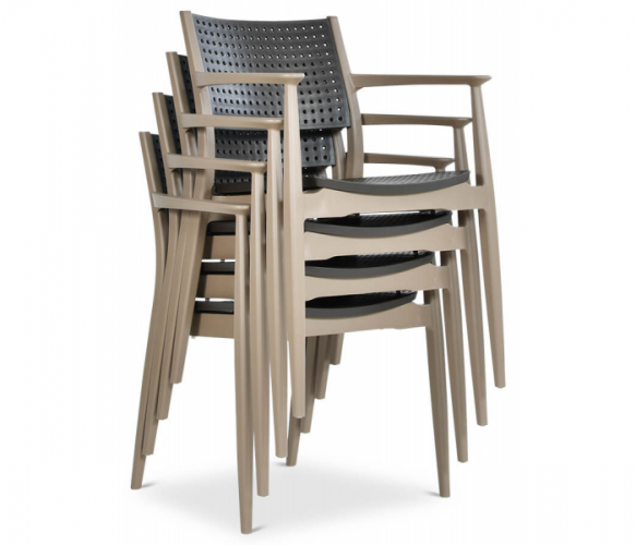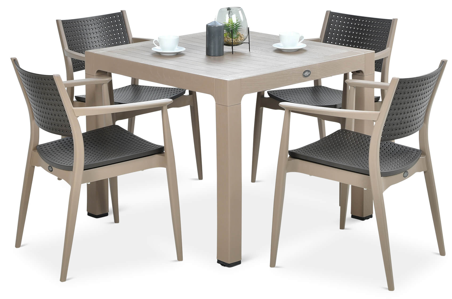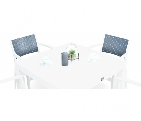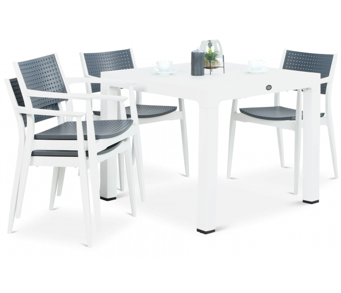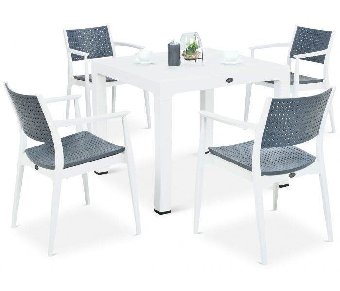 Набор мебели Novussi SEGINUS стол + 4 кресла – отличается необычайной функциональностью и современным стилем – сочетание белого и антрацитового цвета идеально гармонирует с современными тенденциями обустройства. Набор Seginus 4 рассчитан на 4 человека и состоит из квадратного практического стола и 4 профилированных стульев с подлокотниками. Стулья можно складывать один в один, что значительно облегчает их хранение, а ножки стола можно регулировать – вы легко компенсируете небольшие неровности пола. Набор изготовлен из высококачественного полипропилена, армированного стекловолокном, что делает его чрезвычайно прочным и устойчивым к неблагоприятным погодным условиям – ветру, воде, УФ-излучению, низким температурам. Особого внимания заслуживает его необычная структура – каркас использует текстуру дерева, а сиденья и спинки стульев покрыты модным пунктирным рисунком, который также выполняет практическую функцию – обеспечивает свободную циркуляцию воздуха, создавая ощущение ветра. на коже. Комплект мебели Seginus 4 прошел строгие испытания качества, получив сертификат CATAS, гарантирующий безопасное использование в общественных местах – несмотря на интенсивное использование, он сохранит свой внешний вид и свойства в течение многих сезонов. Набор посвящен индустрии HoReCa, но вы с успехом можете использовать его для обустройства домашней террасы – получится отлично!