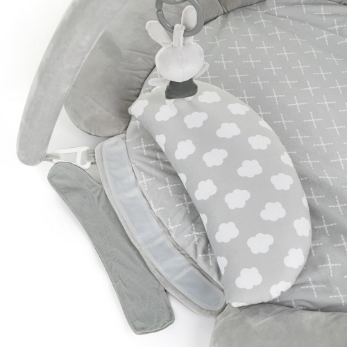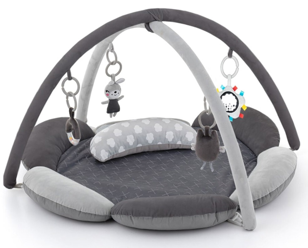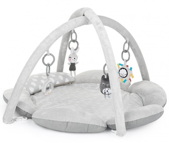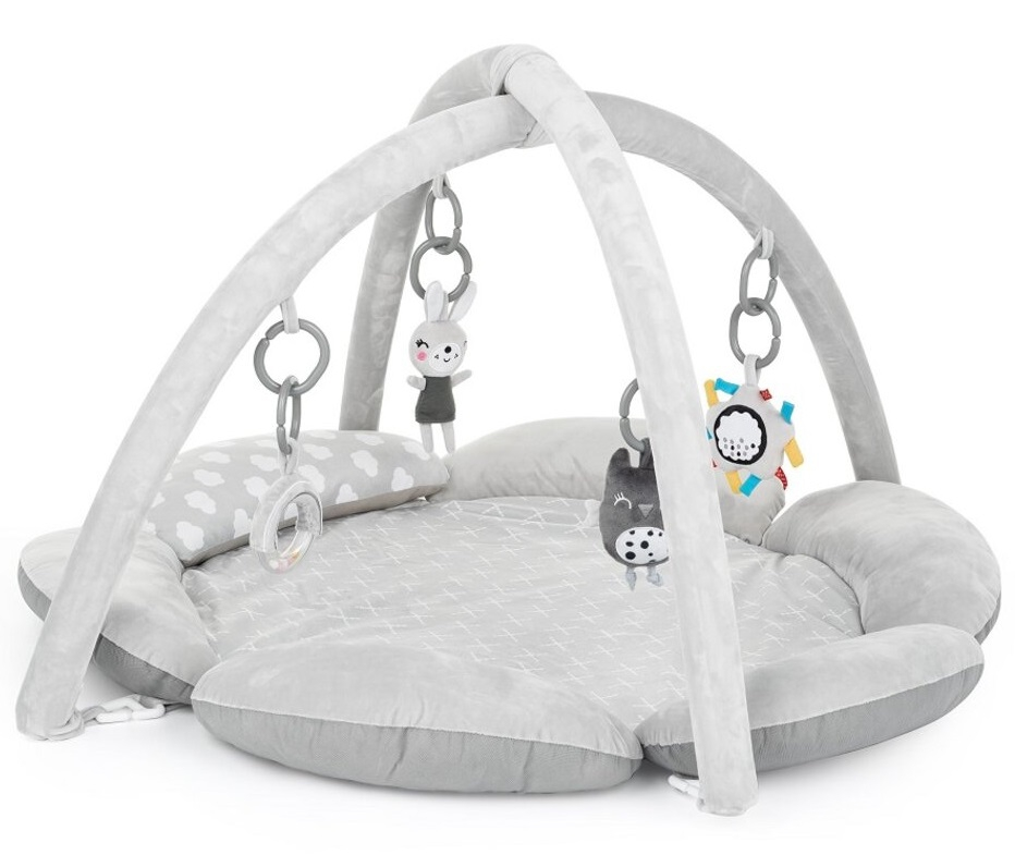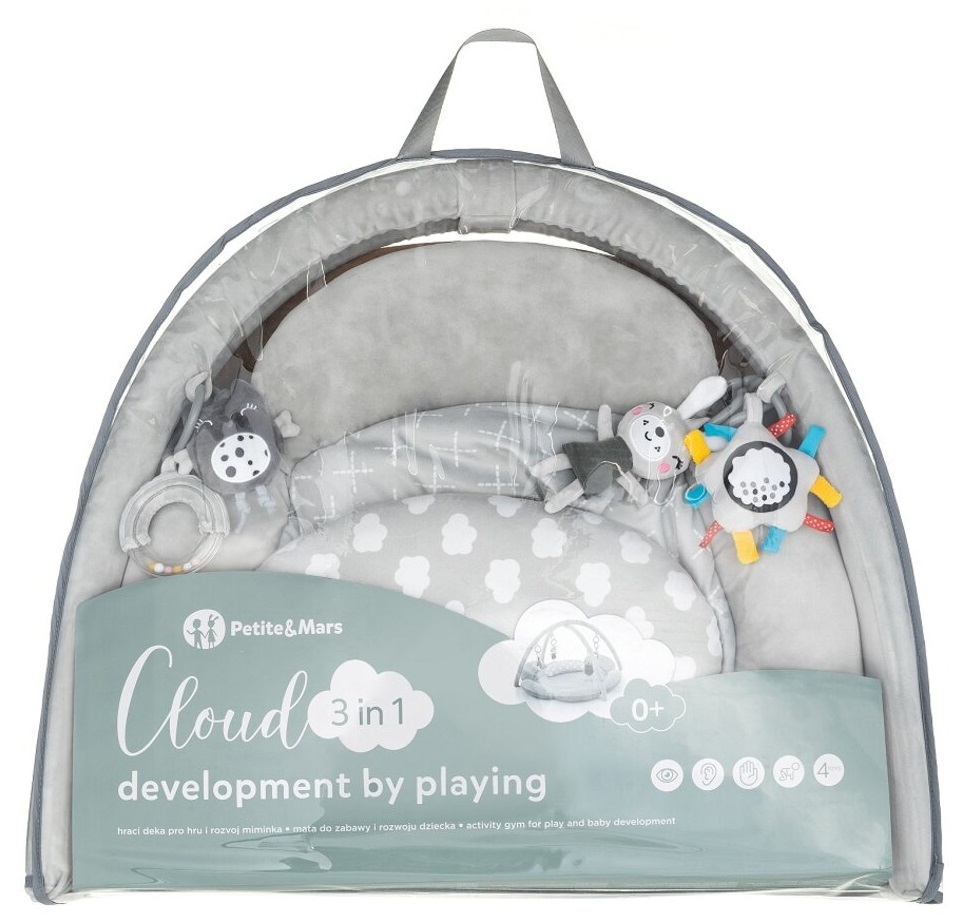 Развивающий коврик 3в1 Petite and Mars Cloud - с подвесными игрушками Cloud от 0 месяцев. Развивающий коврик с подвесными игрушками идеально подходит для развития ребенка, поскольку сочетает в себе коврик и 4 игрушки. Малыш может безопасно лежать на мягком матрасике и наблюдать за игрушками, развивая таким образом зрительное наблюдение. Черно-белые детали на игрушках стимулируют зрение ребенка в первые недели жизни. Подушку можно стирать в стиральной машине при температуре 30°C. Материал: наружные части 100% полиэстер, внутри 100% полипропилен.