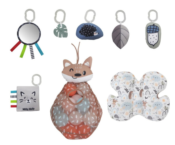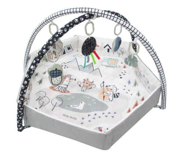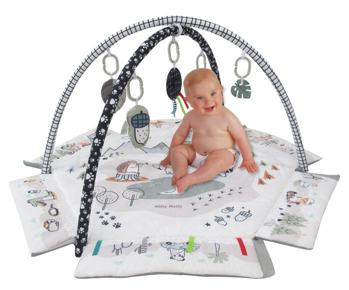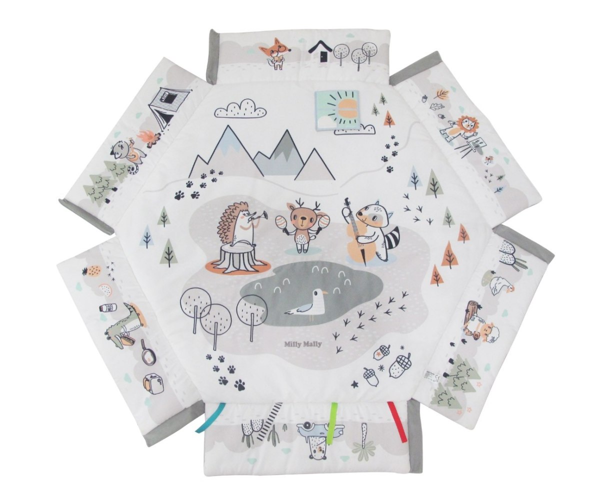 Развивающий коврик 5в1 Milly Mally Minky – это универсальное место для игр и развития малышей. Благодаря мягким штангам с подвешенными сенсорными игрушками (зеркало с лентами, книга, прорезыватель для зубов, листочек, ежик и желудь) коврик увлечет детей разными способами. Его можно использовать как классический игровой коврик, манеж с поднятыми бортиками, а также как «бассейн» с мячиками.Ребенок может играть с подвесными игрушками, которые можно снимать и играть с ними отдельно или хватать развивающий его мячик. Он также может лечь на животик и коснуться сенсорных лент, вшитых на одной из сторон коврика.Одна из сторон, к которой можно прикрепить сенсорную книжку, имеет опоры на задней части, которые позволяют разместить только одну из сторон коврика.