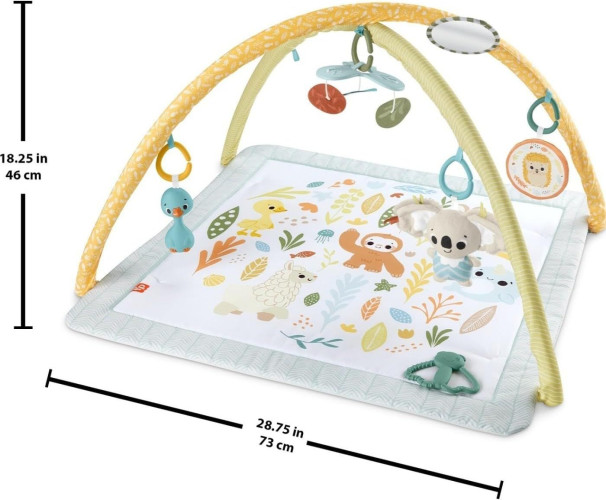 Развивающий коврик FISHER PRICE с дугами PREMIUM – это красочный детский коврик, который растет вместе с вашим ребенком, начиная от лежания и игр и времени, когда лежит на животе, до путешествий. В тренажерном зале есть арка с 6 сенсорными игрушками, которые можно переставлять, включая портативную плюшевую коалу с мягким звонком и мобильный телефон, который можно прикрепить к коляске для развлечений в дороге. Другие сенсорные игрушки включают зеркало для самопознания, гусиную погремушку, прорезыватель для зубов, не содержащий бисфенола А, и мягкую сложную игрушку, которую можно переставить на арку в спортзале или использовать для игр в путешествиях.