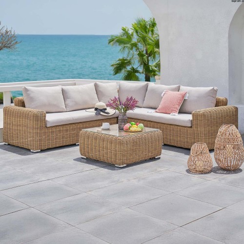 Комплект садовой мебели FURRORE JAKARTA CAFFE – это суть стиля, комфорта и долговечности, созданный для тех, кто хочет превратить свои террасы и сады в оазисы отдыха. Изготовленный из материалов высокого качества, этот набор не только поражает своим дизайном, но также предлагает функциональность и долговечность. Конструкция углового дивана на основе крепкого алюминиевого каркаса гарантирует легкость и устойчивость к погодным условиям. Весь он покрыт плетением из техноротанга в бежевых и коричневых оттенках. Подушки сиденья толщиной 10 см обеспечивают не только мягкость, но и долговечность и лёгкость чистки. Их светло-бежевый оттенок гармонирует с теплыми тонами техноротанга, придавая всему комплекту элегантный вневременной характер. Набор дополнен квадратным журнальным столиком, идеальным для утреннего кофе, послеобеденного чая или вечерних встреч при свечах. Столешница изготовлена из закаленного стекла толщиной 5 мм, что подчеркивает современный стиль мебели. Угловой диван JAKARTA CAFFE Beige – это не только идеальное место для отдыха, но и инвестиция в долговечность и престиж. Благодаря использованию материалов, устойчивых к внешним условиям, мебель остается красивой на протяжении многих сезонов без нужды в трудоемком уходе. Это идеальный выбор для тех, кто ценит высокое качество и непревзойденный комфорт. Превратите свое пространство сегодня и позвольте себе моменты отдыха в окружении стиля и природы!