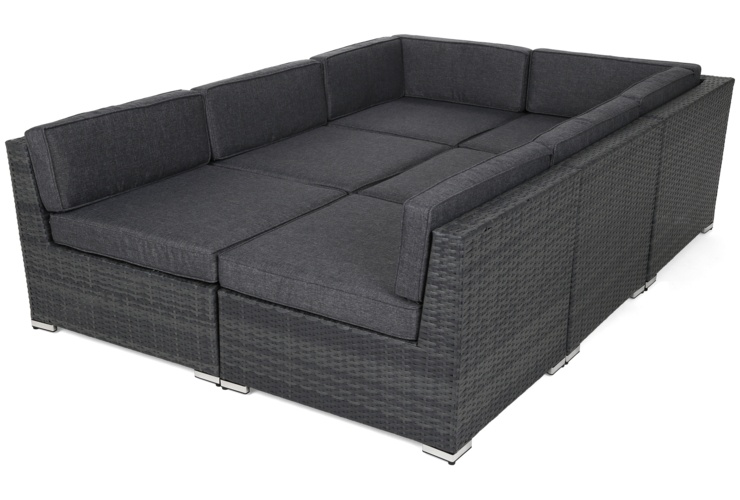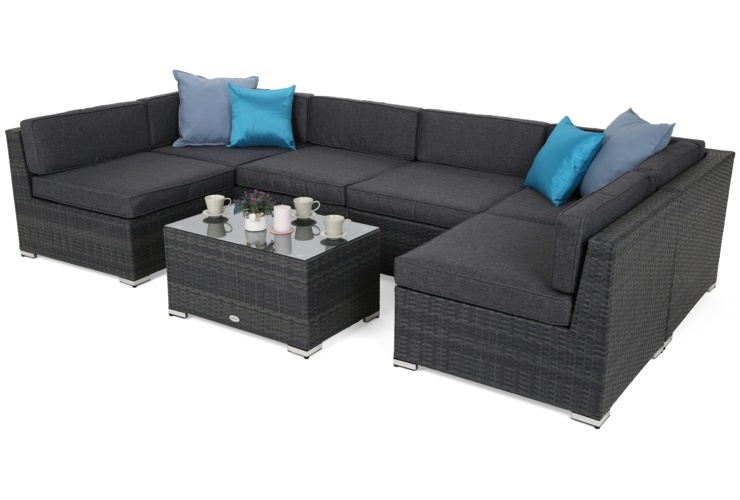 - В комплект входят 2 угловых сегмента, 4 средних сегмента, столик, стеклянная панель для столика, подушки согласно добавленной спецификации, зажимы для крепления