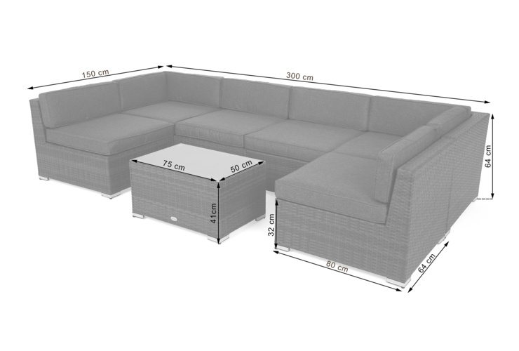 - Размеры (Ш х Г х В) 300 см х 150 см х 68 см (примечание: размеры комплекта в конфигурации как на первом фото)