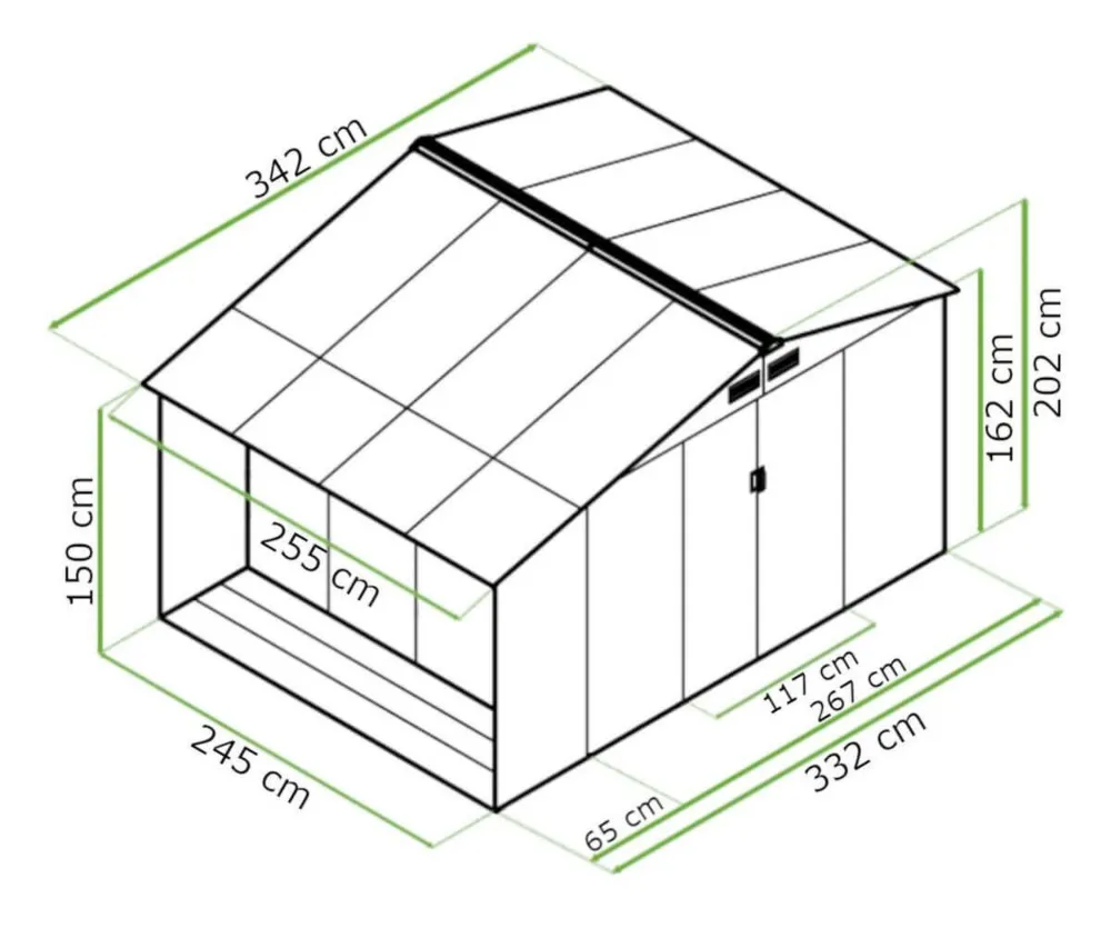 - Внешние размеры с крышей: ¦ ширина: 342 см глубина: 255 см рост: 202 см