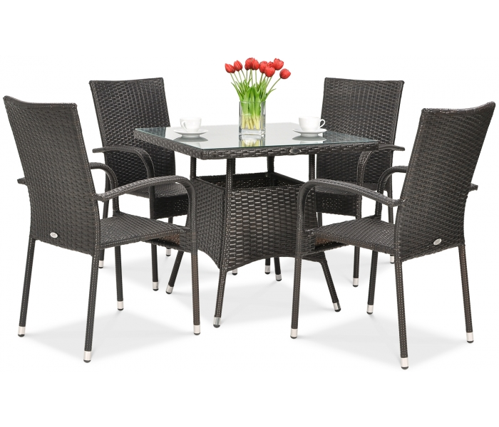 Столик LUGO – это оригинальный и очень элегантный обеденный стол, рассчитанный на 4 человека. Изготовлен из высококачественного алюминия и техноротанга, наиболее прочных материалов, устойчивых к погодным условиям и УФ-излучению. Среди других преимуществ – интересный дизайн и приятный дизайн. Стол отлично выполняет свою роль в гастрономии, ресторанах и кафе, а также в саду, на террасе и жилых интерьерах.