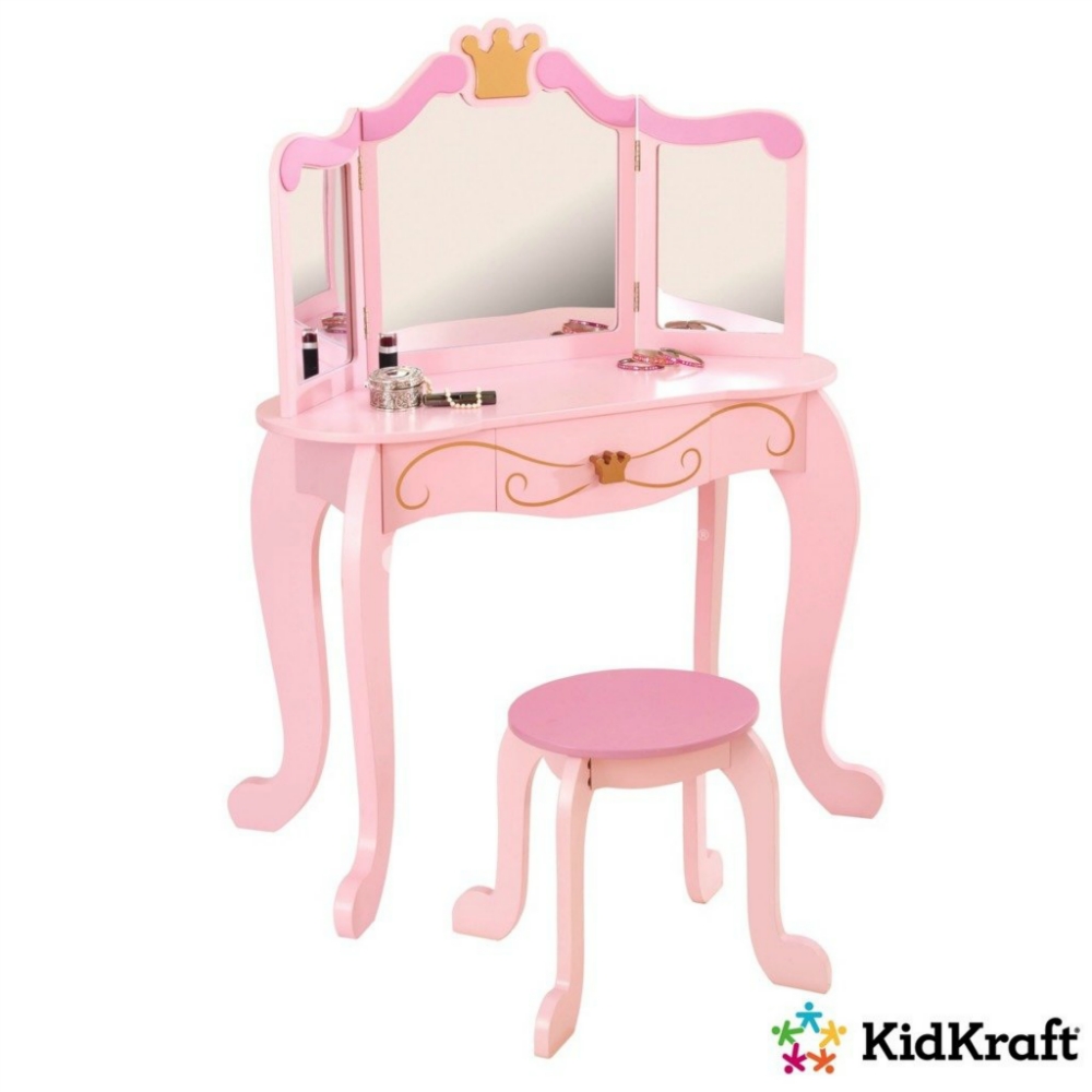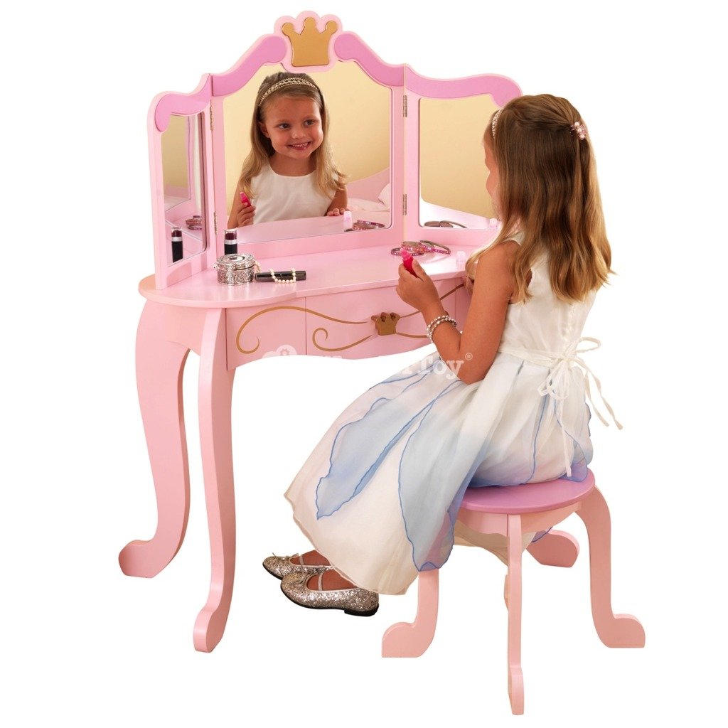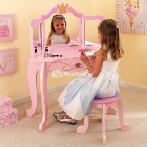 Красивый Деревянный туалетный столик с сиденьем Princess Kidkraft 76123 для девочек с большим, широким зеркалом на 3 крыла обеспечивает комфортное использование. В комплекте с туалетным столиком поставляется прочный табурет. Туалетный столик украшен королевскими и княжескими мотивами, выкрашенными в золотой цвет.