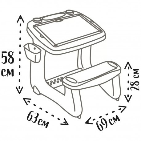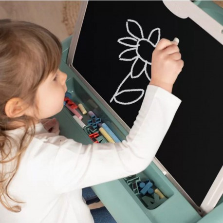 Детский стол с доской для рисования +80 аксесс Smoby - это предложение для детей, которые любят творческие игры. Доска имеет две поверхности. Дети могут рисовать на черной доске цветным мелом, развивая свое воображение и стимулируя творческие способности. Они могут прикреплять магнитные буквы или писать маркером на белом, который также магнитен, изучая свои первые слова и математические задачи. Привлекательная и веселая форма обучения позволяет быстрее усваивать знания. Доску можно разместить в двух положениях. На столешнице есть отделение для хранения посуды. Кроме того, сбоку на столе есть полка, где можно хранить магнитные элементы.