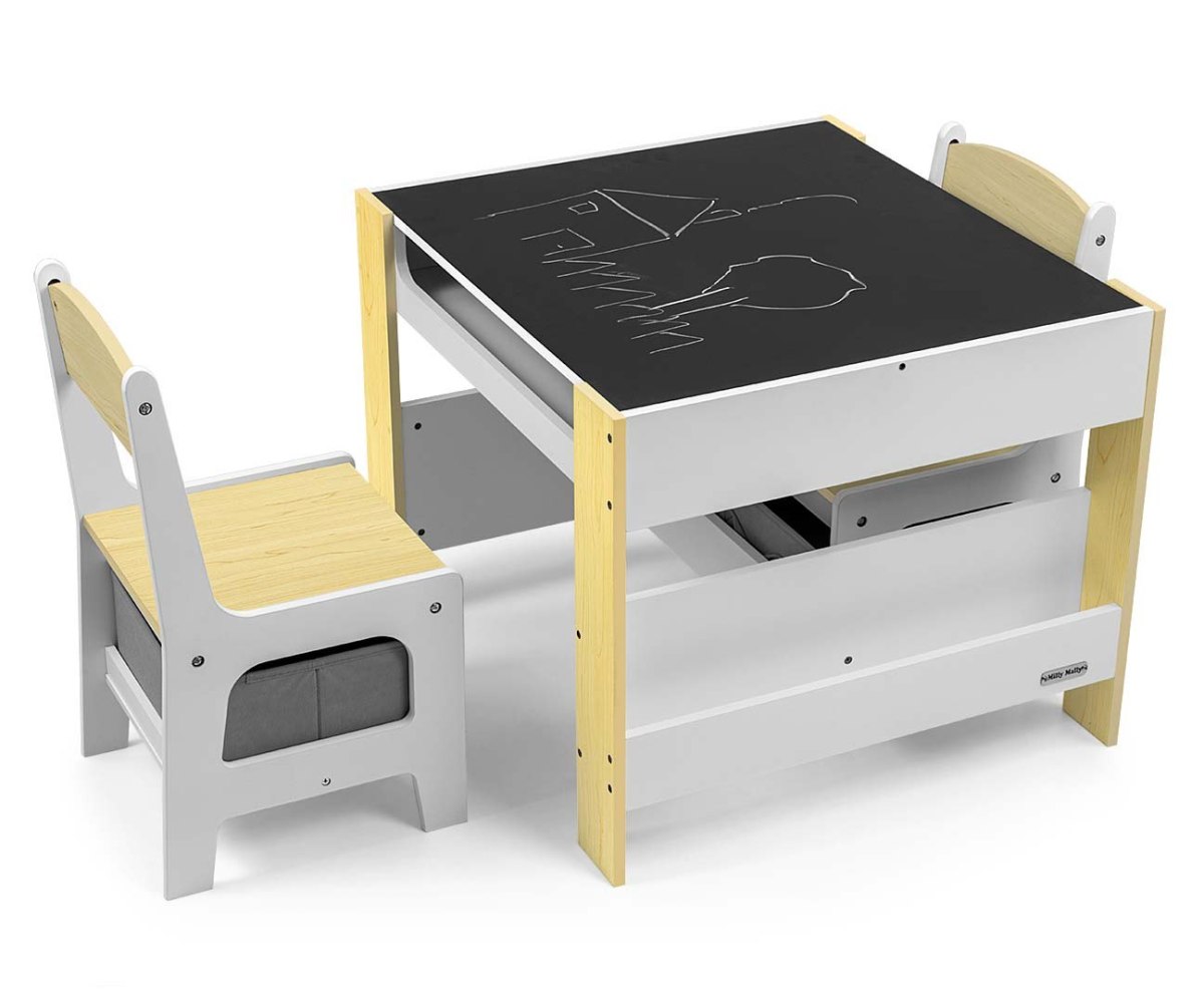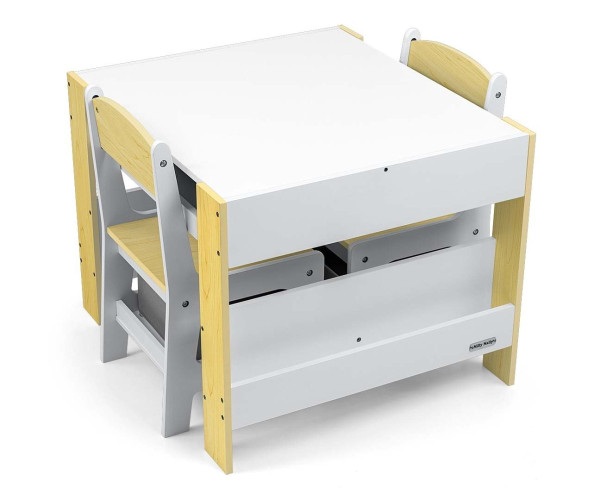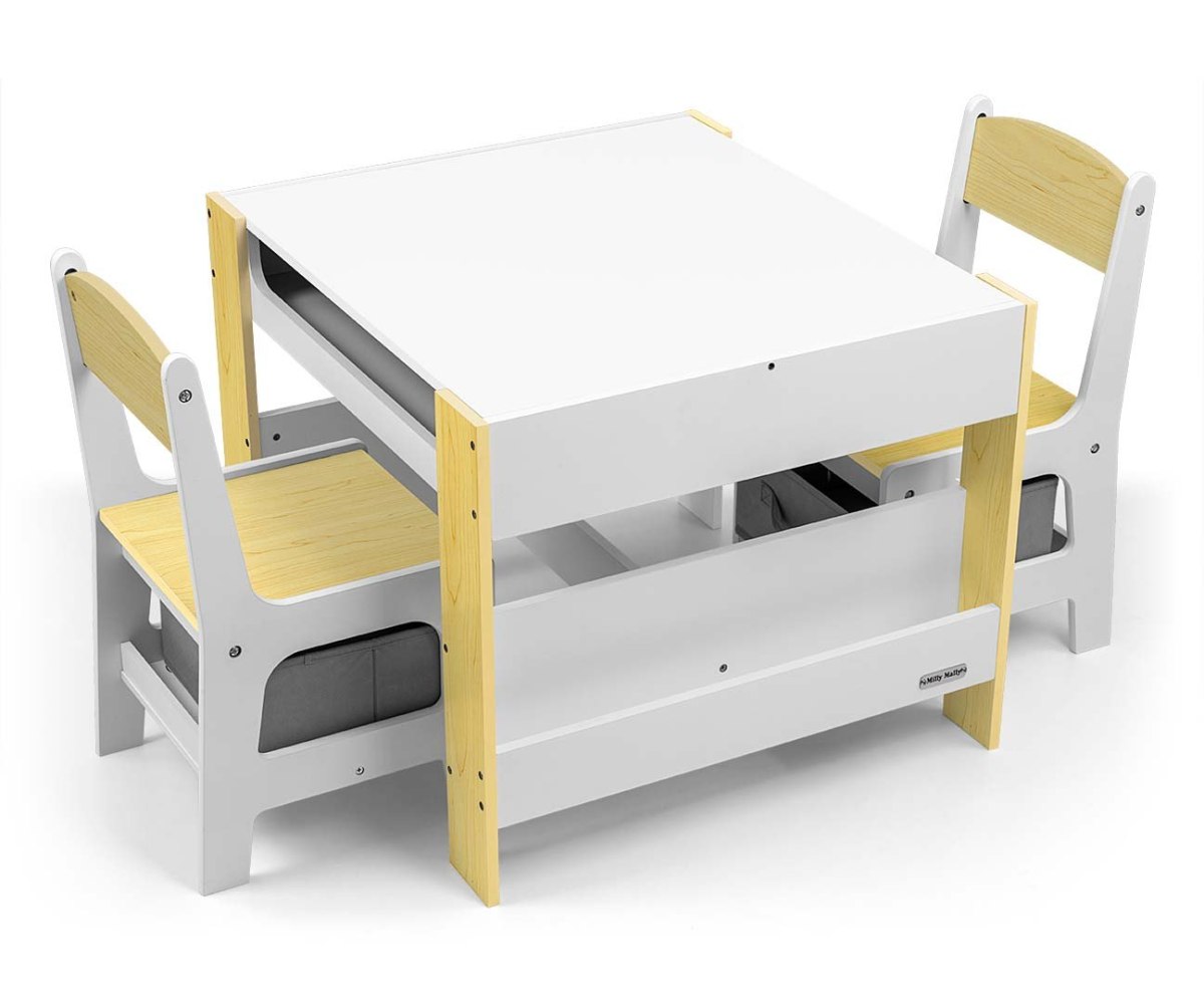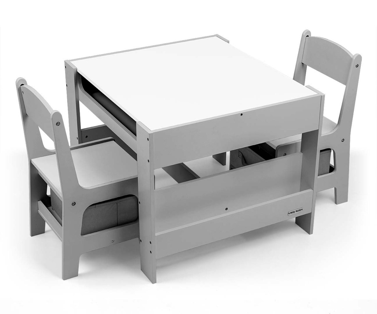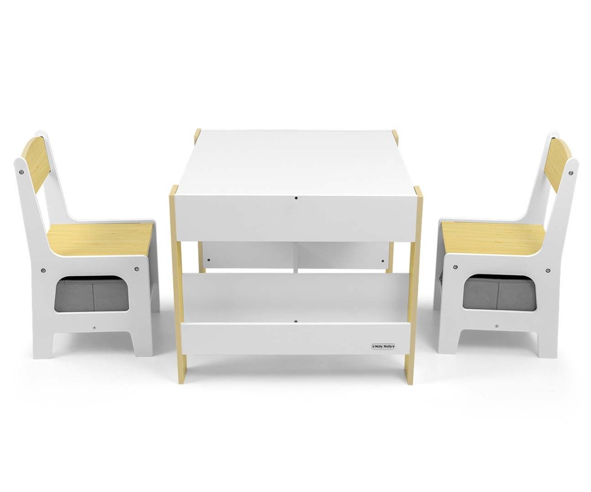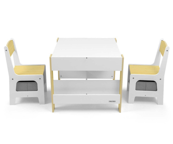 Набор детской мебели Milly Mally Sven – создан, чтобы обеспечить детям: комфорт, простор для творческих игр, рисование, письма и максимальный комфорт во время занятий. В набор входят 2 стулья с 2 текстильными ящиками для хранения, спрятанными на полке под стульями. Стол оборудован огромным отделением для хранения, расположенным под двухсторонней съемной столешницей. Также есть боковые полки для хранения. Одна сторона столешницы – это большая доска для рисования. Стулья легкие, дети могут их свободно передвигать.Мебель изготовлена с исключительной точностью и заботливостью . Оба кресла имеют закругленные углы, чтобы защитить ребенка от травм. Все элементы конструкции стола и стульев обеспечивают высокую стойкость и минимизируют риск падения. Гарнитур Sven изготовлен из МДФ, прочен и прост в уходе. Мебельный гарнитур легко собирается, все необходимые для сборки элементы есть в комплекте. Привлекательности нашего набора добавляют нежные бело-серые цвета и отсеки для вещей, которые могут развлечь детей – дети с удовольствием будут прятать там свои «сокровища». Несомненным преимуществом сбалансированного цвета является то, что предметы, которыми окружают детей дошкольного возраста, в значительной степени влияют на их правильное развитие. Если мы обеспечиваем детям спокойствие и гармонию в окружении, они достигают лучших результатов. Мебельный набор – стол и два стула Sven соответствует этим предположениям, это залог развития и самостоятельности ребенка. Компактный дизайн позволяет легко транспортировать и хранить.