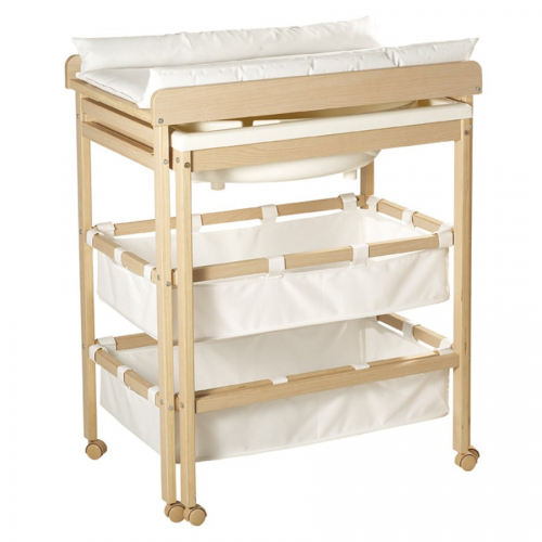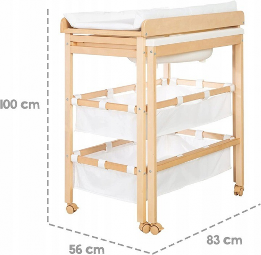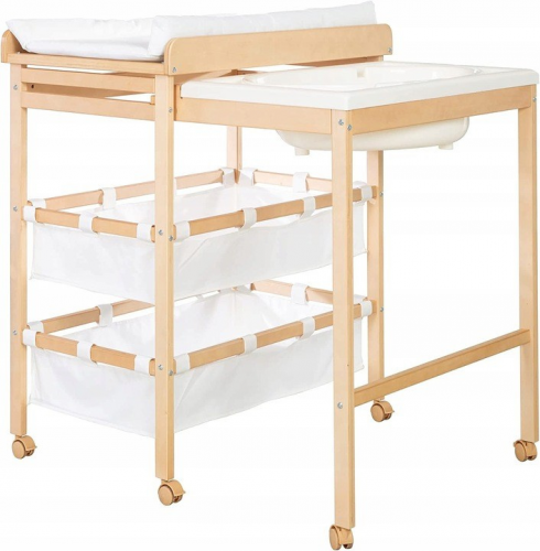 Ванночка с раздвижным пеленальным столиком на колесах Roba - комбинацию Roba можно одним простым шагом превратить из пеленального столика на станцию для ухода за ребенком с ванночкой. Благодаря встроенной ванночке (примерно 60x35 см) купание вашего ребенка станет веселым и беззаботным. Вам больше не нужно наклоняться, чтобы искупать вашего малыша. Сливной шланг ванны позволяет легко сливать воду из ванны, не передвигая ее. Переменная высота 94 см- особенно удобна для вашей спины. Простой и прочный коврик для пеленания (размер лежачей зоны 83x51 см) с мягкими защитными краями покрыт полиуретаном и поэтому особенно приятен для кожи вашего ребенка. Комбинация для ухода за ребенком включает в себя два отделения для хранения, изготовленные из прочного материала, для хранения всех необходимых принадлежностей для ухода за ребенком, необходимого для переодевания и купания. Устойчивый каркас пеленального столика изготовлен из дерева. Кроме того, выдвижная комбинированная ванна имеет колесики с тормозами (можно легко перемещать с одной стороны и легко фиксировать с другой).