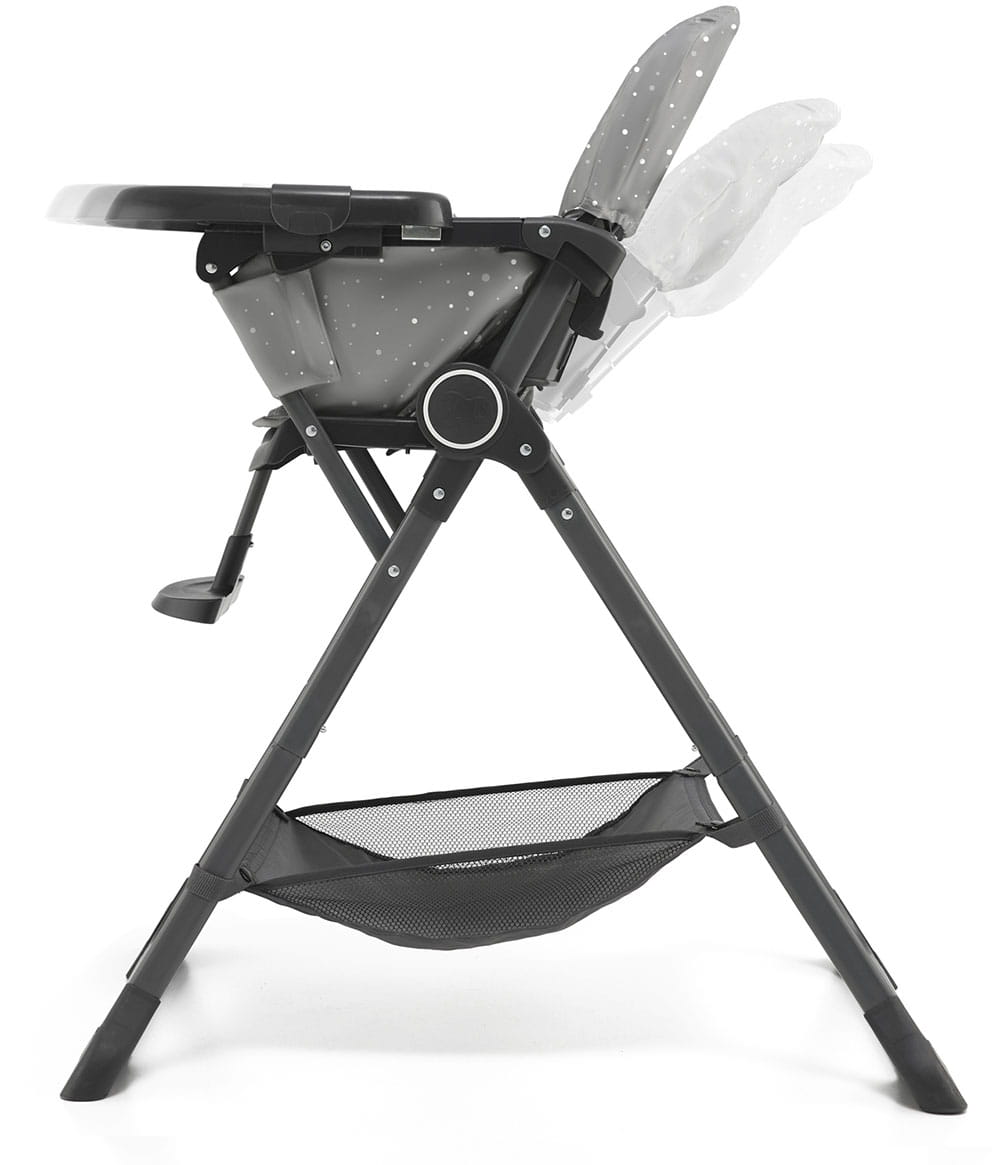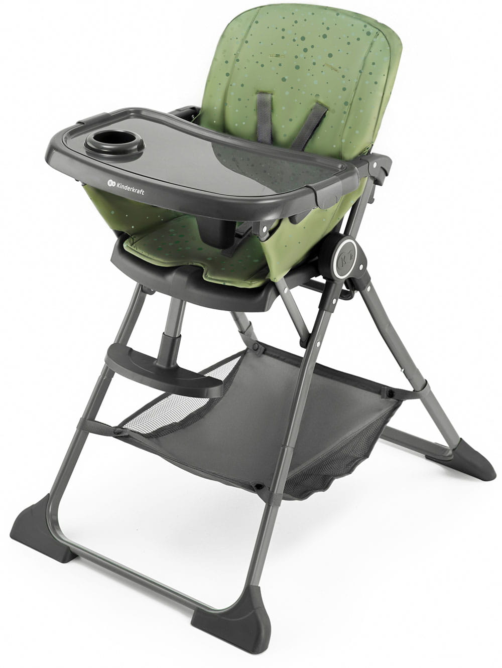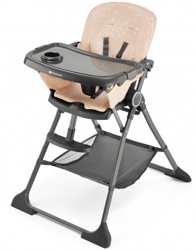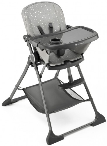 - Сидение стульчика Kinderkraft Foldee регулируется в трех точках: спинка откидывается, подножка регулируется и двойной поднос, который можно отрегулировать в 3 ступенях расстояния от сиденья.