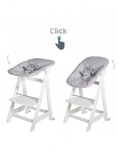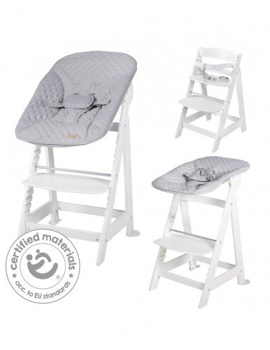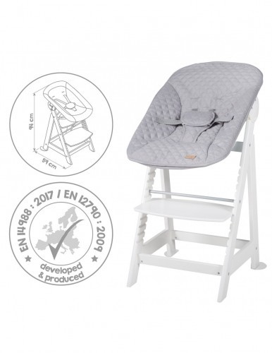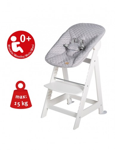 Стульчик для кормления/шезлонг 2в1 Roba Born Up White - состоит из белого деревянного детского стульчика для кормления, который растет вместе с вашим ребенком, и шезлонга, на котором малыш лежит комфортно и безопасно. Шезлонг регулируется в 2 положения - положение для сна и положение для кормления нажатием одной кнопки. Подходит от 0 до 6 месяцев, весом до 9 кг. Стульчик для кормления с 3-точечными ремнями безопасности разработан в соответствии с действующим в Германии стандарта DIN EN 14988: 2017. Стульчик для кормления гарантирует эргономичное, безопасное и комфортное сидение вашего ребенка до подросткового возраста. Roba Born Up White с функцией откидывания и 5-точечной системой ремней обеспечивает длительное использование и долговечность с рождения. Стульчик roba (без сиденья) выдерживает нагрузку до 50 кг. Обивку можно стирать при 40°C. Все используемые материалы проверены на содержание вредных веществ и сертифицированы.