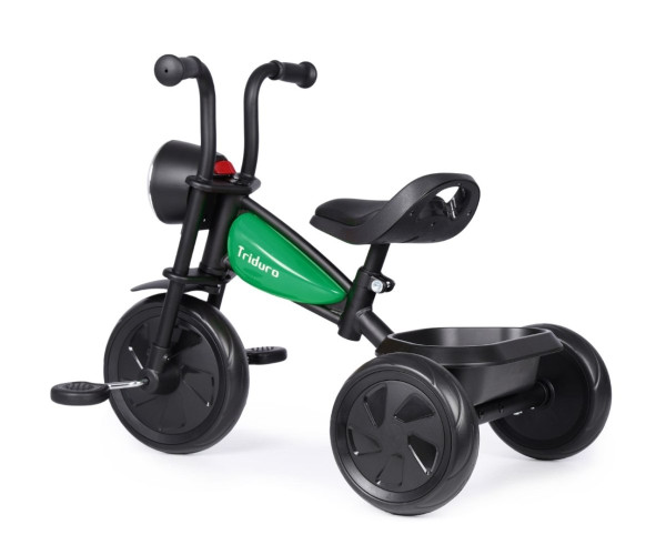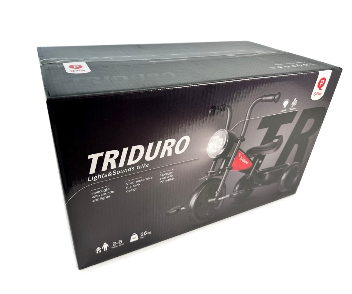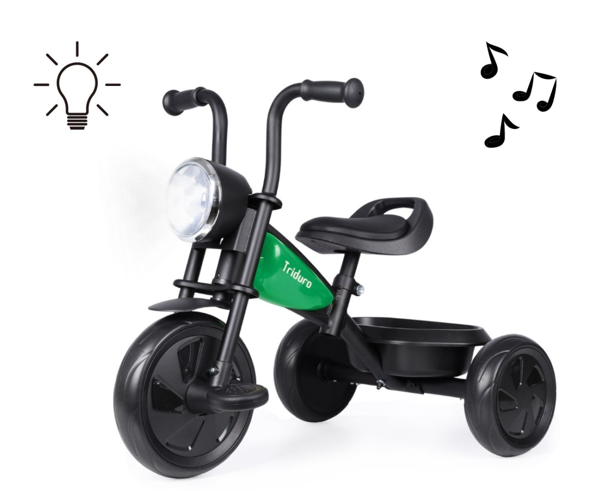 Трехколесный велосипед Qplay Triduro - выглядит как мотоцикл и имеет уникальную раму, имитирующую топливные баки, как у настоящего мотоцикла. Эргономичный дизайн, крепкий металлический каркас и резиновые ручки руля обеспечивают малышам крепкий хват во время игры. Руль велосипеда имеет форму мотоцикла, что придает характер и стимулирует воображение ребенка. Лампа Triduro светится с помощью 7 светодиодов, включаемых с помощью кнопки на корпусе лампы. Вторая кнопка на лампе отвечает за звуковые эффекты: звук запуска двигателя и звук срабатывания сигнализации. В задней части велосипеда есть контейнер для игрушек. Регулируемое седло позволит оптимально подстроить велосипед под рост ребенка, поэтому велосипед будет «расти» вместе с юным велосипедистом. Противоскользящие ручки с накладками защитят ручки от стирания. Удобное и профилированное седло обеспечит комфорт при открытии новых велосипедных маршрутов. Трехколесная формула велосипеда и поролоновые колеса обеспечивают стабильность и безопасность на любой поверхности. Для дополнительной безопасности он имеет фиксатор перекручивания. Во время катания на велосипеде ребенок тренирует большую моторику, силу и мышцы ног, удерживает равновесие и усовершенствует координацию движений. Благодаря этому он верно и здорово развивается.