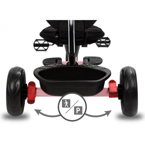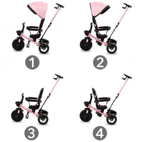 - Откидная спинка сиденья и руль, а также съемная ручка для управления велосипедом позволяют уменьшить размеры велосипеда, что облегчает транспортировку и хранение