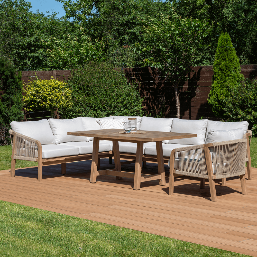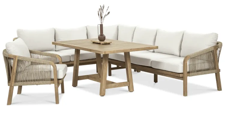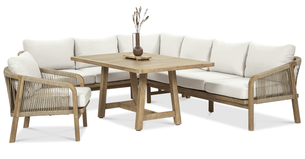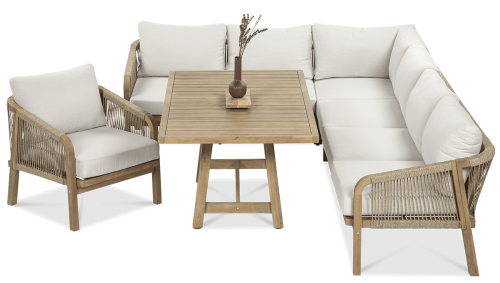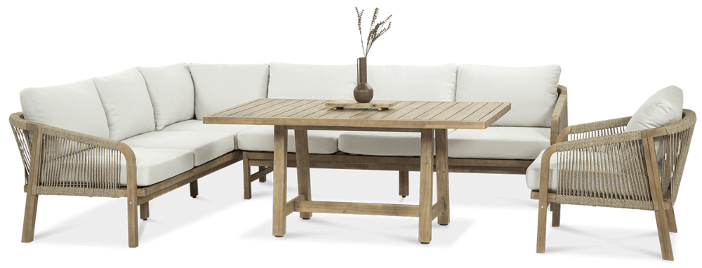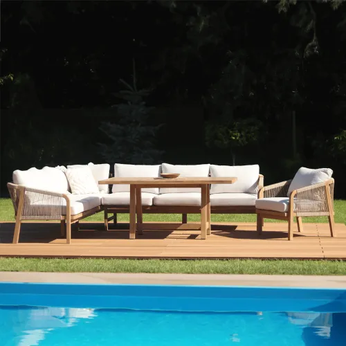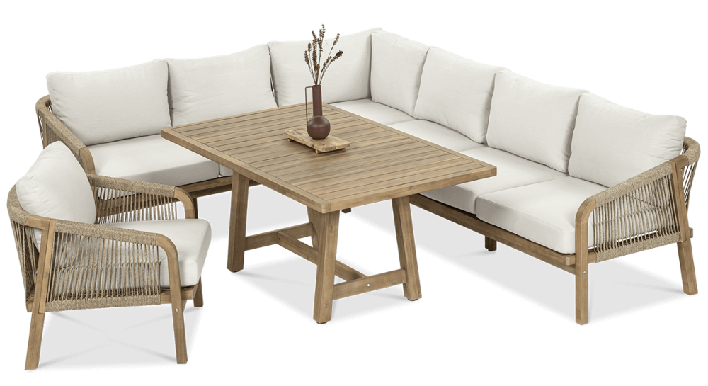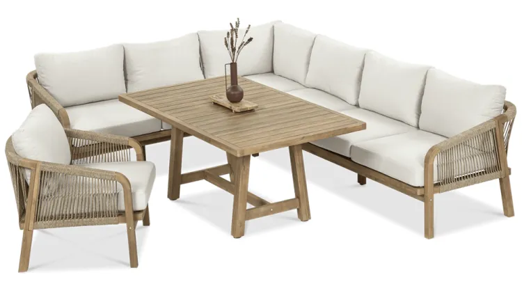 Деревянный угловой диван Furrore Marigold Dining – это роскошный и элегантный угловой диван и кресло премиум-класса, которые идеально дополнят современную террасу в оригинальном стиле. Набор состоит из эффектного дивана, состоящего из двух модулей, дополнительного кресла и прямоугольного журнального столика длиной 150 см, создавая внечасовой набор для семи человек. Мебель изготовлена из натурального дерева акации светлого цвета, что напоминает об экзотическом отдыхе и придает шарму всему устройству. Угловой диван и кресло отличаются высоким качеством исполнения и уникальным дизайном. Мебель украшена полиэстеровой веревкой диаметром 6 мм на спинках, что подчеркивает их элегантный характер. Кроме того, мебель сертифицирована FSC, что означает, что древесина, используемая для их изготовления, происходит из должным образом управляемых лесов.Мебель очень прочная, устойчивая к погодным условиям и УФ-излучению, что обеспечивает долгие годы эксплуатации. Их также легко поддерживать в чистоте, что позволяет легко постирать их водой и постирать наволочки в стиральной машине. Угловой диван MARIGOLD DINING можно произвольно модифицировать, что позволяет создать мини-кофейную зону с креслом и дополнительным столиком. Мебель также хорошо сочетается с рядом натуральных аксессуаров, таких как лен, лоза, дерево или хлопок. Обеденный набор Furrore Marigold – отличный выбор для людей, которые ищут роскошную мебель для обустройства террасы, оранжереи или сада. Эта мебель идеально впишется в естественный стиль интерьера и станет прекрасным дополнением к другим гарнитурам серии MARIGOLD. Это престижный и эксклюзивный бренд, который непременно привлечет внимание гостей и станет украшением пространства вокруг него. Помните! Чтобы деревянную мебель можно было безопасно использовать на улице, ее необходимо правильно подготовить. Таким лечением является импрегнация. Он предусматривает нанесение на мебель специального средства, защищающего мебель от контакта с влагой, а следовательно, от разрушения или деформации. Еще один способ оградить деревянное оборудование от погодных условий – смазать его маслом. В зависимости от того, сколько древесины используется, ее рекомендуется смазывать не реже одного раза в год. Дополнительно также следует защитить мебель чехлом. Хотим обратить ваше внимание на неповторимую красоту и естественность деревянной мебели. Следует помнить, что дерево – живой материал, дышащий. Благодаря этому он привносит свою аутентичную атмосферу в окружение. Однако со временем он может претерпеть незначительные изменения, такие как легкие трещины или изменение оттенка через солнечный свет. Это естественный процесс, подчеркивающий его уникальность.