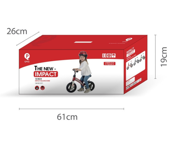 Велобег Qplay Impact – имеет уникальную раму, покрытую цветным пластиковым корпусом. Его 10-дюймовые колеса обеспечивают стабильность. Регулируемый руль и сиденья подстраиваются под рост ребенка, а мягкая обивка сиденья обеспечивает комфорт. Эргономичный дизайн и резиновые ручки руля обеспечивают прочный хват малышей, поскольку резиновые наконечники надежно держат ручки ребенка на месте. Конструкция велосипеда заставляет ребенка сохранять ровную осанку во время катания (не сутулясь). Езда на этом велосипеде обеспечивает нужное количество упражнений и тренирует мышцы. Велосипед QPlay Impact Balance Bike может облегчить малышам переход к езде на велосипеде без стабилизаторов, когда они подрастут, поскольку они уже овладели основными навыками, необходимыми для маленьких велосипедистов - балансом, координацией и управлением.