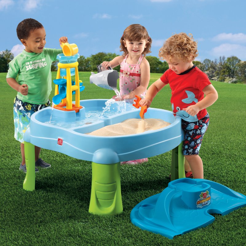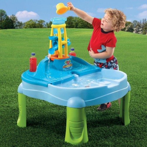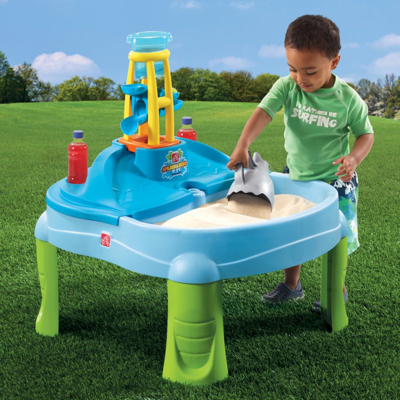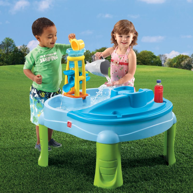 Водный столик 2в1 с аксессуарами STEP2 7267 - водный стол подходит для детей в возрасте от 2 лет. Прочная и долговечная конструкция обеспечивает безопасные игры на открытом воздухе. Этот стол 2-в-1 подарит детям много веселья во время игр с друзьями. Имея два отделения, дети могут строить замки из песка с одной стороны и плавать на игрушечных корабликах с другой. Дополнительной аттракцией является водонапорная башня. Просто налейте в нее воды, чтобы привести в движение ротор. В комплект также входит дополнительная платформа, монтируемая на водяной стол. Истекающая по ней вода создаст водопад, который принесет большую радость каждому ребенку. Он чрезвычайно привлекателен и стимулирует детское воображение. Стол оснащен сливной пробкой для легкого опорожнения и очистки.